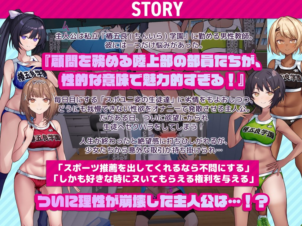 女子陸上部の顧問になったスポユニフェチの主人公が、性欲に耐えながらオナニーしたりセクハラしたりするCG集です。